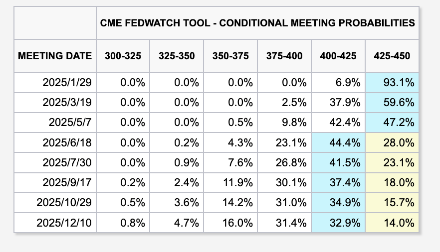 在非农数据公布前,美债与美元飙升对美股造成压力。杨傲正认为,若市场押注美联储暂停降息的概率上升,美元指数与美债收益率有望继续上扬,美股跌势或延续。芝商所美联储观察工具显示,市场预期美联储1月不降息概率为93%,交易员预计2025年上半年不会降息,全年降息幅度仅为37个基点。