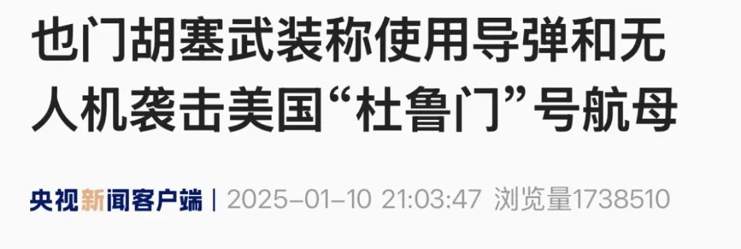 据央视新闻最新报道,当地时间1月10日,也门胡塞武装宣布成功使用多枚导弹和无人机对美国“杜鲁门”号航空母舰及其在红海北部的护航舰队实施了袭击。此次袭击引发了国际社会的广泛关注。