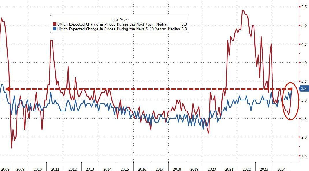 周五,密歇根大学也发布了通胀预期调查。数据显示,美国消费者预期未来5-10年内,美国的通胀将以每年3.3%的速度上升,创下了自2008年以来的新高。此外,在未来一年的通胀预期方面,美国消费者的预期也从前一个月的2.8%跃升至3.3%。