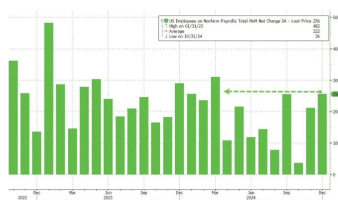 详细数据显示,2024年12月美国失业率意外下降至4.1%,低于预期和前值的4.2%。此外,2024年全年美国非农就业人数合计增加220万人,平均每月增加18.6万人,尽管较2023年的300万人有所减少,但仍高于2019年的200万人。