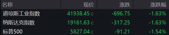 当地时间上周五,美股市场遭遇重挫,三大指数均收跌超过1.5%。其中,道琼斯工业平均指数下滑1.63%,收于41938.45点;纳斯达克综合指数同样下跌1.63%,报19161.63点;标普500指数则下跌1.54%,报收5827.04点。