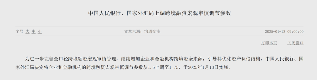 为深化全口径跨境融资宏观审慎管理体系,进一步拓宽企业和金融机构的跨境融资渠道,优化其资产负债配置,中国人民银行与国家外汇局宣布,自2025年1月13日起,将企业和金融机构的跨境融资宏观审慎调节参数由1.5上调至1.75。