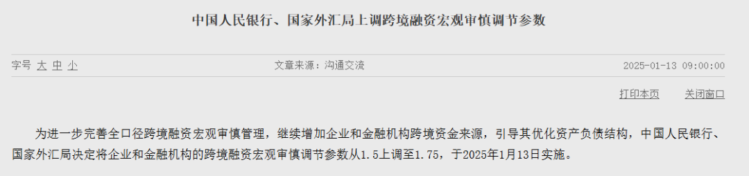 中国人民银行网站于1月13日发布消息称,为了进一步优化全口径跨境融资宏观审慎管理框架,持续拓宽企业和金融机构的跨境融资渠道,并引导其合理调整资产负债结构,中国人民银行与国家外汇管理局联合决定,将企业和金融机构的跨境融资宏观审慎调节参数自1.5上调至1.75,该调整措施自2025年1月13日起正式施行。