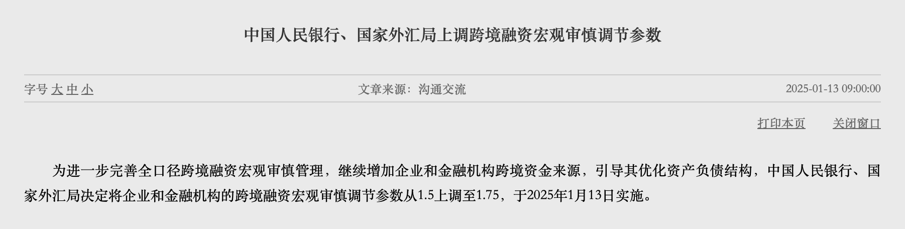 中国人民银行与国家外汇局联合发布通知,将企业和金融机构的跨境融资宏观审慎调节参数上调至1.75,旨在优化资产负债结构,拓宽跨境融资渠道,自2025年1月13日起实施。