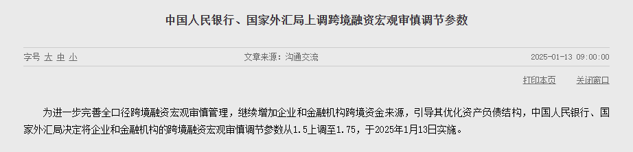 中国人民银行与国家外汇管理局联合决定,自2025年1月13日起,上调企业和金融机构的跨境融资宏观审慎调节参数至1.75,旨在拓宽跨境融资渠道,优化资产负债配置,增强跨境融资灵活性与便利性。