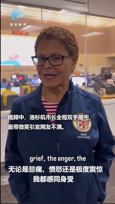 洛杉矶市长在面对公众质询时保持沉默,其对于削减数百万美元消防预算的决定引发了广泛争议。1月12日,市长卡伦·巴斯在社交媒体上发布视频回应山火事件,但其双手插兜、面带微笑的形象再次引发网友不满。