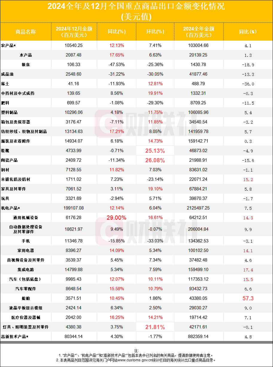 财联社对2024年全年及12月重点商品出口金额变化进行了详细梳理。全年来看,船舶出口成为亮点,出口数量和金额分别同比增长25.1%和57.3%,两项数据均位居全商品前列。此外,未锻轧铝及铝材、通用机械设备、家用电器、集成电路、汽车(包括底盘)等商品的出口金额也实现了超过10%的同比增长。