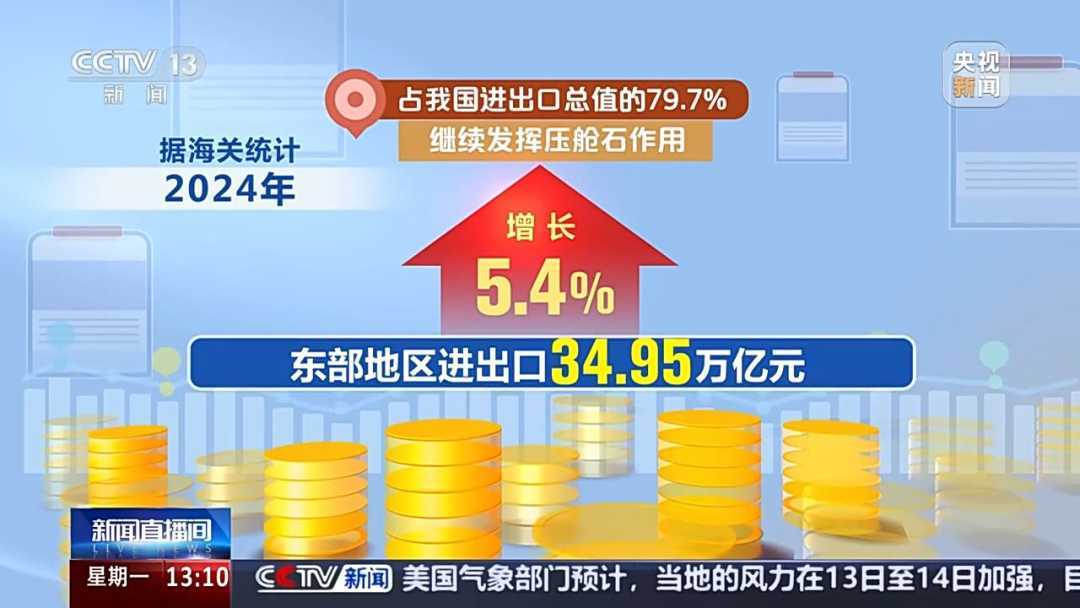 2024年,我国外贸实现质升量稳,区域协调发展活力迸发。东部、中西部和东北地区优势互补,各展所长,进出口全部实现增长。东部地区进出口总额达34.95万亿元,增长5.4%,继续发挥压舱石作用。