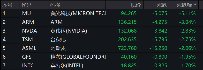 值得注意的是,芯片股板块却遭遇了重创。多只芯片股大幅下跌,其中英伟达盘中一度跌超4%,最终收跌2.83%;台积电也一度跌近4%,最终收跌2.75%;美光科技更是跌超5%。