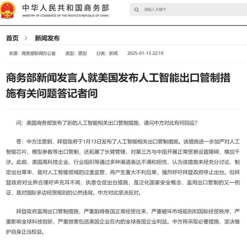 问:美国商务部近期宣布了一系列新的人工智能相关出口管制政策,请问中国对此有何官方回应?