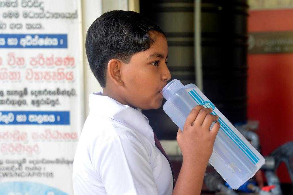2024年10月2日,在斯里兰卡中北部地区尼迪亚村,学生正在中国援建的饮用水装置旁饮水。新华社发(加扬·萨米拉摄)