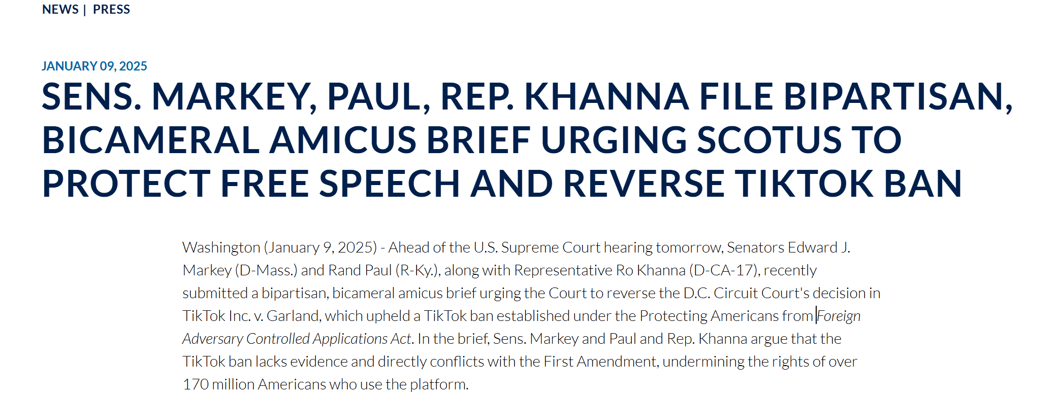 此外,爱德华·马基、罗·康纳与肯塔基州共和党人兰德·保罗还联合提交了一份跨党派的两院简报,敦促美国最高法院推翻华盛顿特区巡回法院在TikTok禁令案中的裁决。他们认为,该禁令缺乏充分证据,且直接违反了美国第一修正案,损害了1.7亿多使用该平台的美国人的权益。