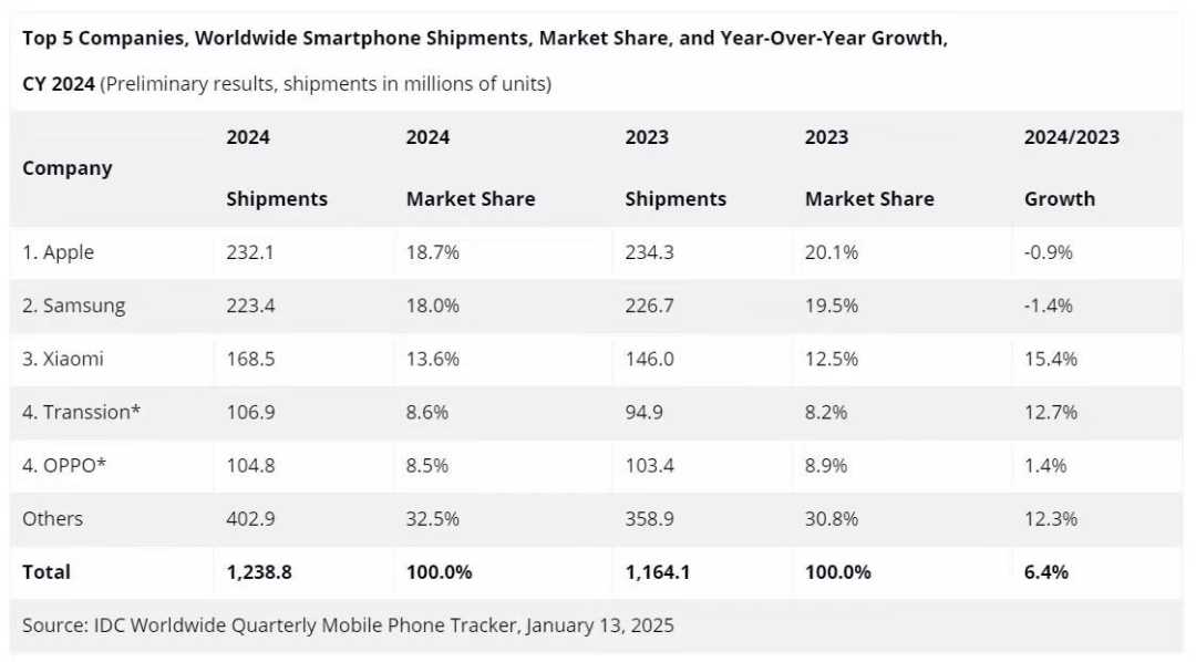 IDC报告:2024年Q4全球智能手机出货量增长,苹果领跑