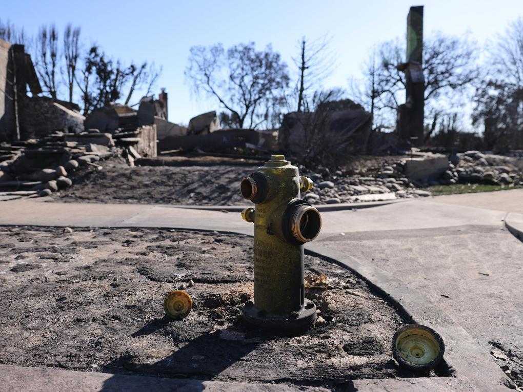 这张1月13日拍摄的照片展示了美国洛杉矶地区“帕利塞兹”山火灾区的一处被火烧毁的消防栓。新华社发(邱晨摄)
