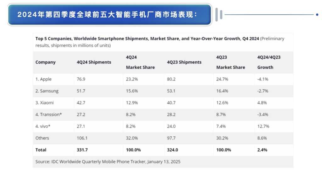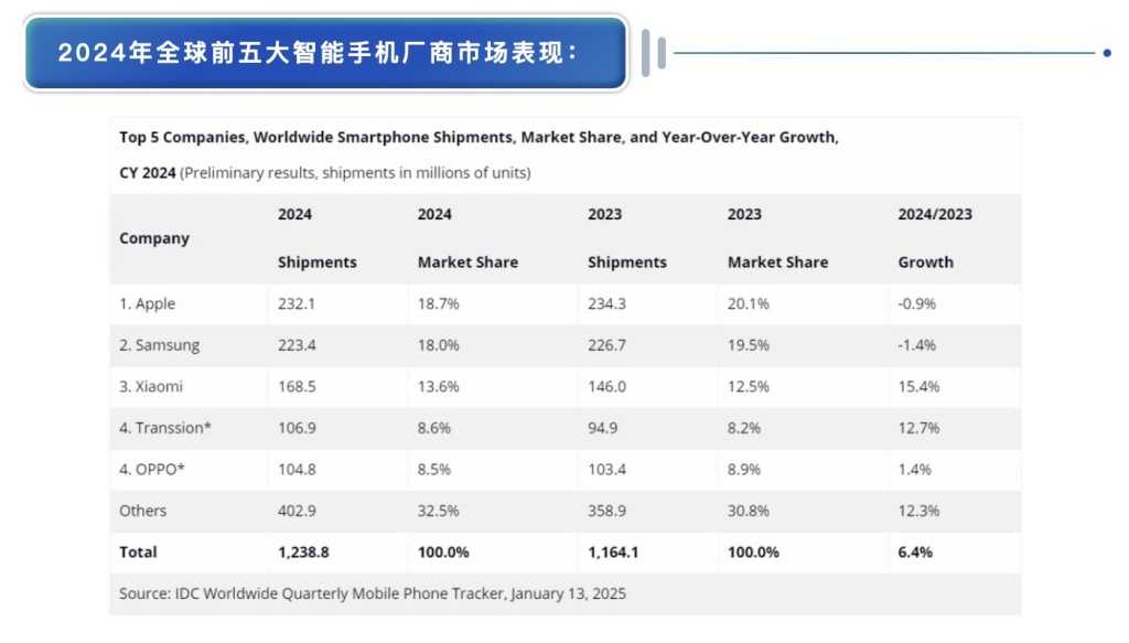 IDC分析指出,尽管苹果和三星保持了市场前两位的位置,但中国厂商凭借在低端设备市场的专注、在中国的快速扩张以及整体市场的推动,成功缩小了与这两家公司的市场份额差距。小米在季度和全年的排名中均位列第三,成为前五名厂商中同比增长率最高的。传音、vivo和OPPO之间的竞争也日益加剧。
