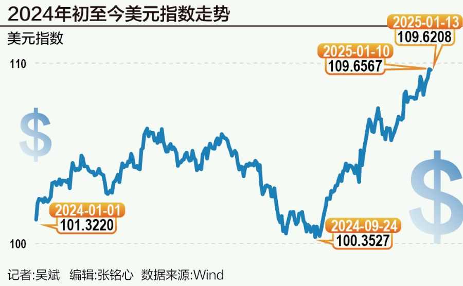 中国银行研究院高级研究员王有鑫分析指出,美元指数的持续走高,一方面受到鹰派美联储和美国当选总统特朗普政策预期的影响,美联储的鹰派立场使得美元资产回报率持续处于高位,而特朗普政府的政策导向,如潜在的关税上调,可能加剧通胀压力,从而进一步推高美元。另一方面,美元指数的走高也反映了近期美国经济相关指标的变化,美国劳动力市场走势逐渐平稳,私人消费维持较快增长,这些变化也对美元形成了有力支撑。此外,日本央行加息时点的不断延后、欧洲央行等不断降息以及全球地缘局势的持续紧张等因素,也对美元指数的上涨产生了影响。