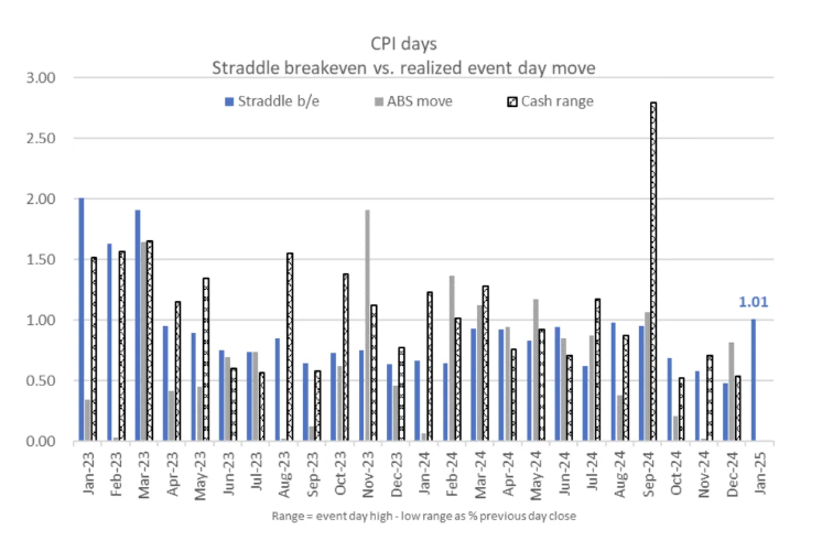 花旗集团美国股票交易策略主管Stuart Kaiser指出,基于期权价格的隐含波动率显示,标普500指数可能会因12月美国CPI数据的公布而产生大幅波动,波动幅度可能达到1%。这是自2023年3月美国地区银行危机以来,CPI数据发布前所观察到的最大隐含波动。