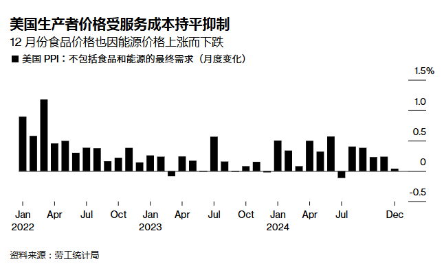 根据美国劳工统计局周二发布的报告,2024年12月生产者价格指数(PPI)环比仅上涨0.2%,低于11月的0.4%涨幅以及市场预期的0.4%。剔除食品和能源价格后的核心PPI环比持平,而市场预期为上涨0.3%。进一步剔除贸易服务后的指标也仅上涨0.1%。