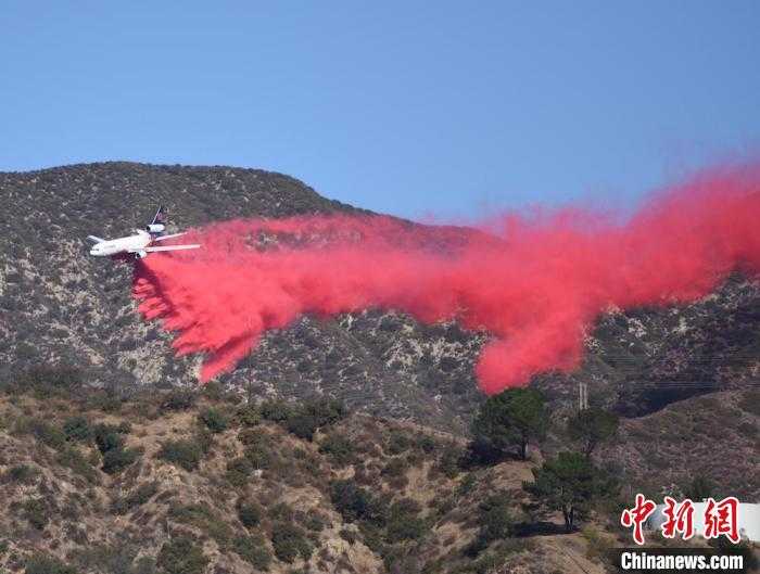 当地时间1月13日,美国加利福尼亚州洛杉矶郡,一架消防飞机正在“伊顿大火”(Eaton Fire)区域上空投放阻燃剂,以遏制火势的进一步蔓延。中新社记者张朔摄
