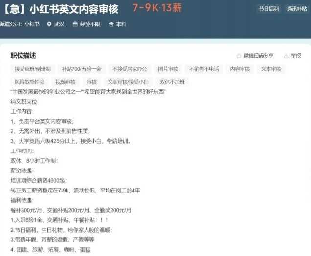 招聘平台显示,急招小红书英文内容审核
