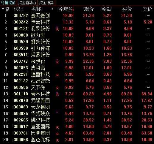 截至午盘,包括壹网壹创、佳云科技、利欧股份、歌力思、狮头股份、引力传媒、爱慕股份、来伊份、皮阿诺、遥望科技、汇洲智能、天下秀在内的多家公司股票涨停,青木科技、元隆雅图、天龙集团等多股跟涨。