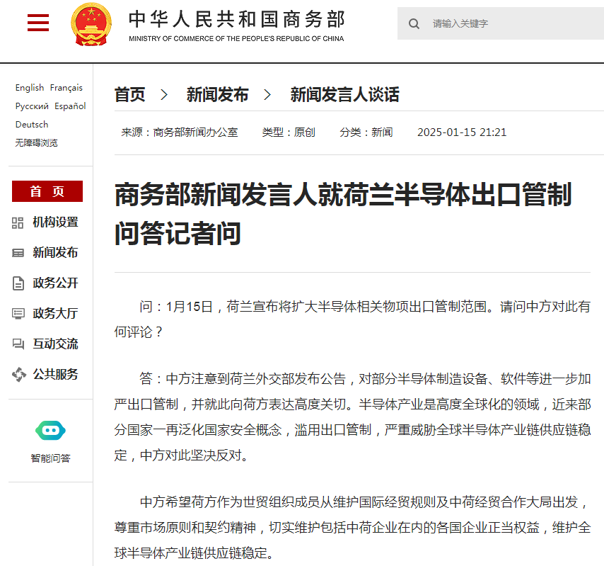 问:2025年1月15日,荷兰政府正式宣布将扩大对半导体相关物项的出口管制范围。请问,中国政府对这一决定有何具体评论和看法?
