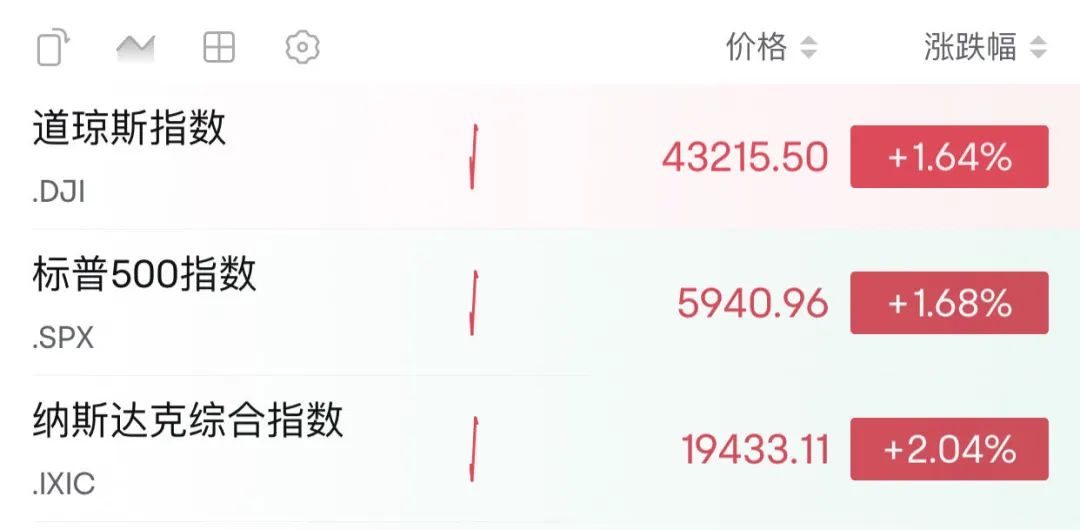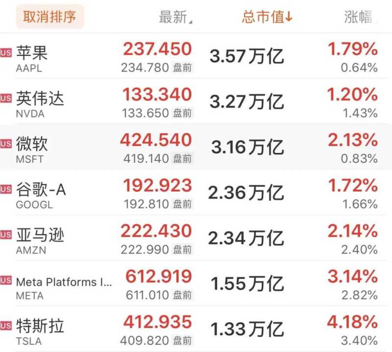 受此影响,美股市场大幅高开,截至发稿,道琼斯工业平均指数上涨1.64%,标普500指数上涨1.68%,纳斯达克综合指数上涨2.04%。大型科技股普遍上涨,特斯拉股价涨幅超过4%,Meta涨幅超过3%,微软和亚马逊涨幅均超过2%,苹果和谷歌A类股涨幅接近2%,英伟达涨幅超过1%。