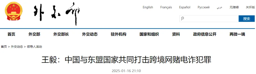 2025年1月16日,王毅在京会见东盟10国驻华使节,就泰缅边境地区频繁发生的网络赌博与电信诈骗案件进行深入交流,强调需加强国际合作,坚决打击此类犯罪活动,维护地区安全与稳定。