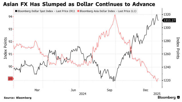 与此同时,美元在全球外汇市场上继续保持强势,而特朗普即将就职前的政策不确定性也让亚洲货币交易员感到不安。这些不确定性使得利率决策变得越来越难以预测,进一步加剧了市场的波动性。