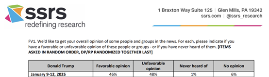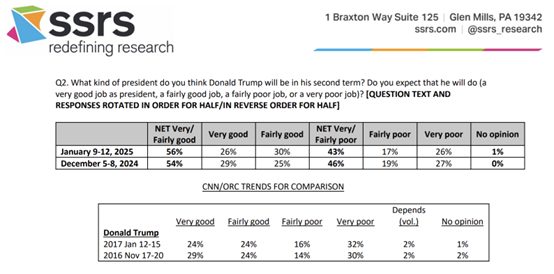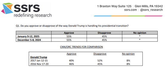 该调查由民调机构SSRS于1月9日至12日进行,样本为1205名美国成年人,误差幅度为±3.2个百分点。