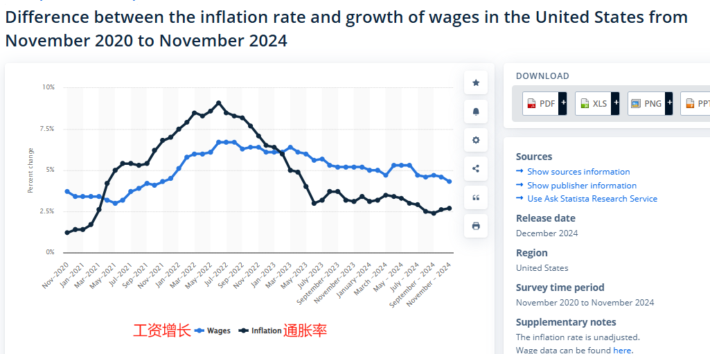 从2020年11月到2024年11月美国的通胀与工资增长变化图片来源:Statista