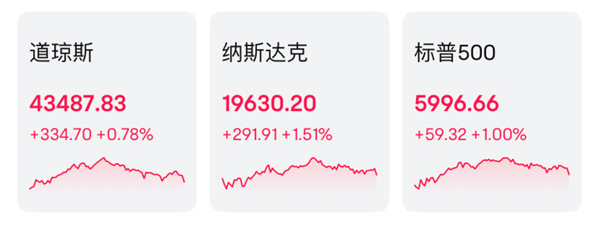 在周五的交易中,美国三大股指均实现了上涨。截至收盘,道琼斯工业平均指数上涨0.78%,报43487.83点;标准普尔500指数上涨1%,报5996.66点;纳斯达克综合指数上涨1.51%,报19630.2点。本周以来,三大股指均录得了不俗的涨幅,其中道指累涨3.69%,标普500指数涨2.91%,纳指涨2.45%。