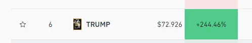 自推出以来,TRUMP币迅速走红,开盘价为0.1824美元,而截至发稿时,其价格已涨破70美元,涨幅高达约40000%。这一惊人涨幅引发了市场的广泛关注和讨论。