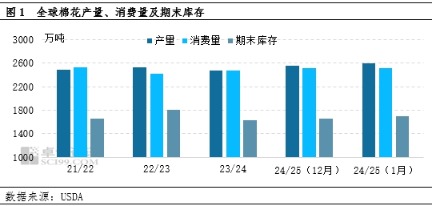 USDA发布2025年首份全球棉花市场供需报告,上调2024/25年度全球棉花产量和期末库存,特别是中国棉花产量及期末库存超预期上调,对国内外棉花市场带来利空影响,预计短期国内外棉花市场价格或联动下跌。