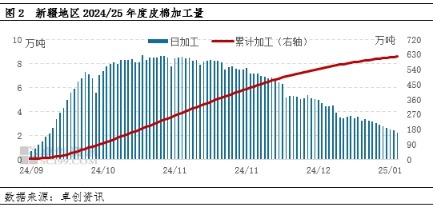 值得注意的是,USDA在1月份的报告中特别上调了中国棉花的产量预期,这可能与中国新季棉花实际加工量超预期增加有关。截至2025年1月10日,中国棉花主产区新疆累计加工2024/25年度皮棉数量已达到620万吨,远超上年度全年产量,并较2024年同期增加100万吨,增幅达19%。这使得业界对2025年棉花增产的预期不断提高,USDA因此在本期供需报告中将中国棉花产量上调至653.2万吨。