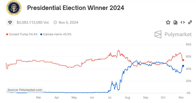 备受关注的大选预测平台Polymarket的数据显示,特朗普赢得今年大选的概率已降至54.5%,而哈里斯的胜选概率则迅速回升至45.5%。相比之下,在上周五,即便特朗普的胜率已有所回落,但仍高达63.2%。