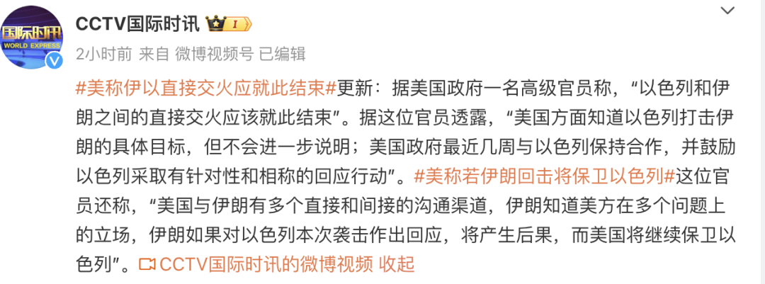 △以军发言人哈加里发布袭击结束的视频声明(视频截图)