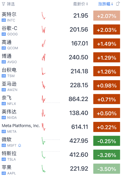 在科技股方面,表现呈现分化,其中Alphabet(谷歌母公司)股价上涨超过2%,亚马逊、博通公司股价也分别上涨约1%。然而,苹果与特斯拉股价却大幅下跌超过3%,对科技股主导的纳斯达克指数构成压力。