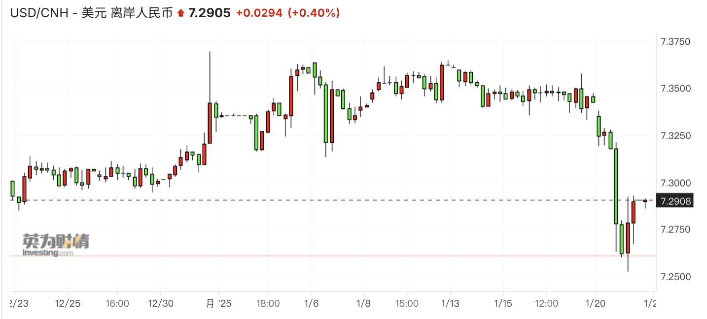 尽管美元走弱,但中国央行仍继续将人民币中间价调至比模型预测更强的水平,延续了维稳信号。1月21日,美元对人民币中间价下跌183个基点至7.1703,这是自去年11月以来中间价日内最大的调整,原因是美元隔夜大幅下跌。尽管如此,交易员表示,中间价仍比模型估计值强1231个基点,央行调强中间价的幅度仍然不小,但弱于前一日的1400个基点,这可能也表明中国央行倾向于适时缩小即期与中间价之间的差距。