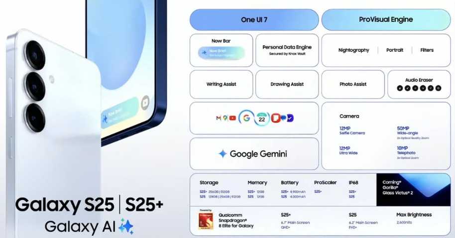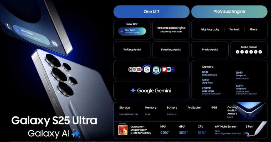 与去年相似,Galaxy S25系列沿用了“矩形平板”的设计元素,三款机型(Galaxy S25、S25+、S25 Ultra)价格区间为799美元至1299美元,均搭载了定制版高通骁龙8 Elite处理器。三星宣称,与上一代产品相比,Galaxy S25系列的NPU性能提升40%、CPU提升37%、GPU提升30%。