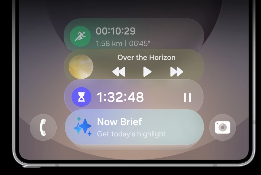 除AI功能外,One UI 7还在手机底部增设实时状态通知栏“Now Bar”,功能类似苹果的“灵动岛”,可展示赛事比分、外卖送达时间、计时器及音乐等应用的实时动态。