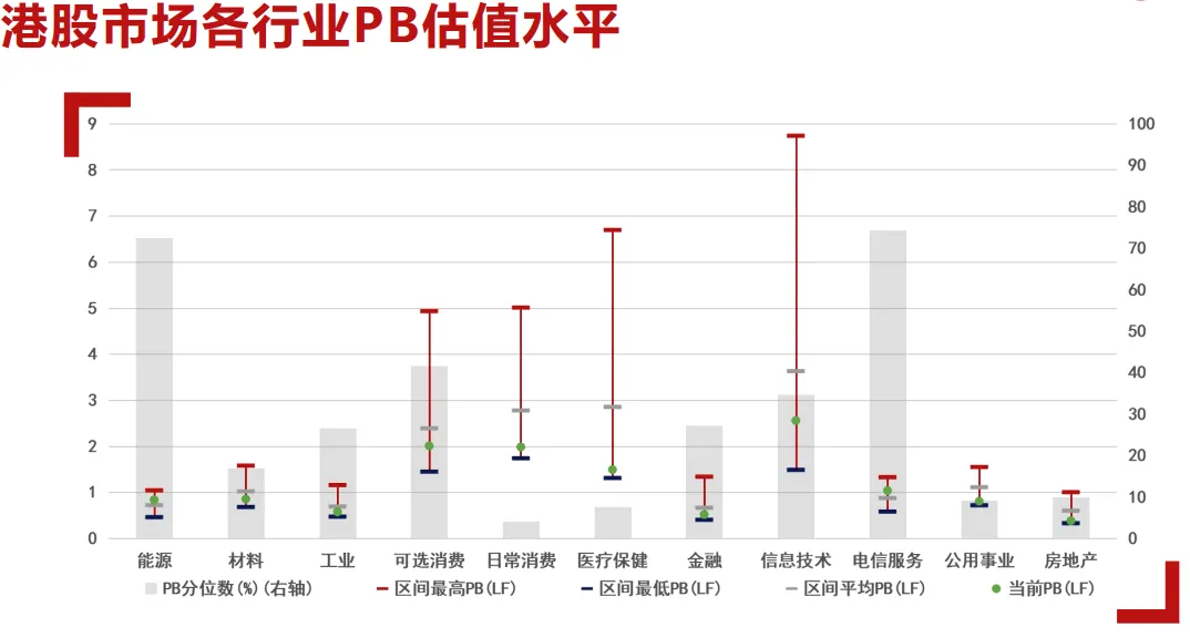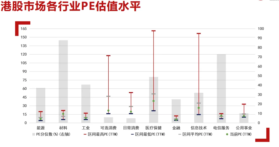估值数据方面,截至上周,港股市场中的可选消费和日常消费板块市盈率PE(TTM)均处于2018年以来的20%以下分位;日常消费的市净率PB(TTM)也处于同期10%分位以下,这些板块在当前的市场上属于估值较低的领域。