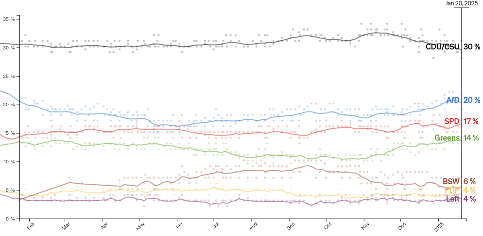 根据最新民调结果显示,基民盟仍以约30%的支持率领跑,而极右翼另类选择党的支持率则稳定在20%左右。鉴于几乎没有政党愿意与选择党结盟,因此默茨领导的联合政府很可能成为下届德国政府的主要构成。