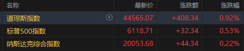 具体收盘数据显示,道琼斯工业平均指数上涨0.92%,收于44,565.07点;标普500指数攀升0.53%,报6,118.71点,创历史收盘新高;纳斯达克综合指数微涨0.22%,报20,053.68点。至此,三大指数已连续四个交易日录得日线上涨。