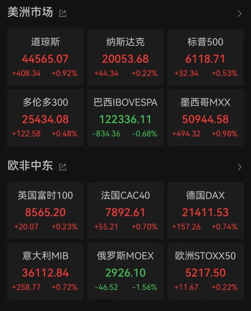 与此同时,欧洲股市同样表现出色,法国CAC40指数、德国DAX指数以及意大利MIB指数均实现了0.7%以上的涨幅。