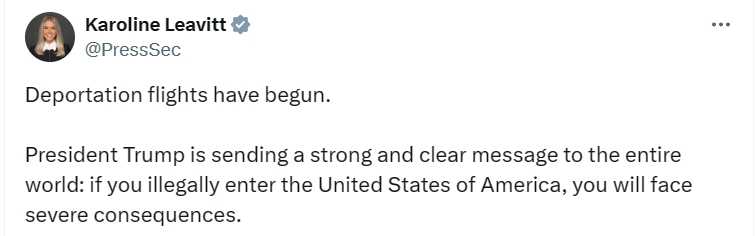 莱维特在社交媒体平台上分享了多张照片,展示了被戴上手铐的人员正登上军用飞机的场景。她强调:“驱逐航班已正式启动,特朗普总统正通过此举向全球传递一个强烈而明确的信号:任何非法进入美国的人都将面临严厉的后果。”