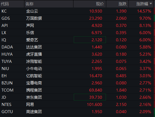 个股方面,金山云涨幅接近15%,万国数据上涨超过9%,声网涨幅超过8%,爱奇艺上涨6%。此外,虎牙直播、达达集团涨幅超过5%,小牛电动、亿航智能等涨幅超过3%,京东集团、网易、高途集团等涨幅也超过2%。这些个股的强劲表现进一步推动了中国金龙指数的上涨。