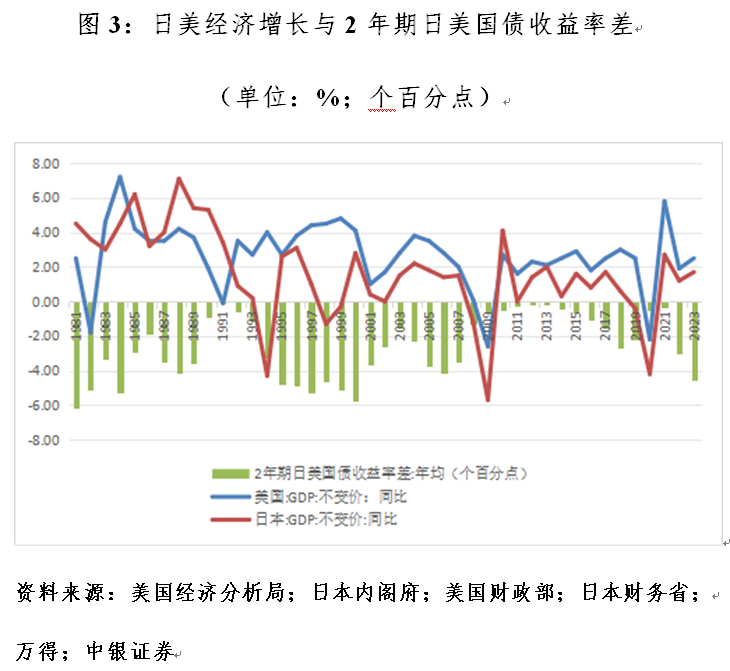 日元升值是在日美长期负利差情况下取得的。二战后,美国为稳定日本经济制定了“道奇计划”,实施固定汇率制度。随着日本经济起飞,日元震荡升值,但大部分时间日美利率呈倒挂状态。1985年广场协议后,日元快速升值,但10年期日美国债收益率差一直为负。日元汇率升至历史新高时,负利差依然持续。2021年以来,日元汇率“三连跌”,但与其说是利差驱动,不如说是日美经济周期和货币政策分化所致。