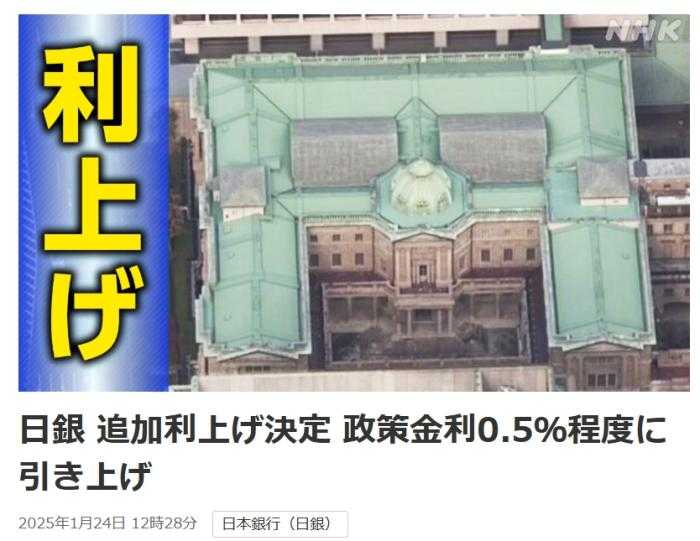 中新网1月24日电,据日本权威媒体日本广播协会(NHK)最新报道,日本央行在1月24日闭幕的货币政策决策会议上,做出了重大决策,将政策利率上调至约0.5%,这一数字刷新了日本近17年来的新高。