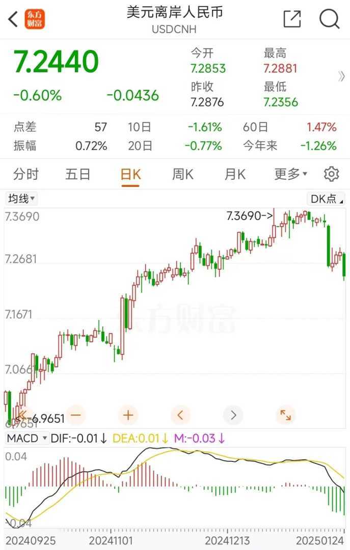 业内人士指出,中国资产在美股市场的强劲表现与人民币的大幅升值密切相关。周五,离岸人民币兑美元汇率盘中一度飙升超过500个基点,突破7.24关口,创下近两个月新高。收盘时,离岸人民币报7.244,较前一交易日上涨436个基点。自2025年初以来,人民币兑美元汇率已累计上涨1250点。
